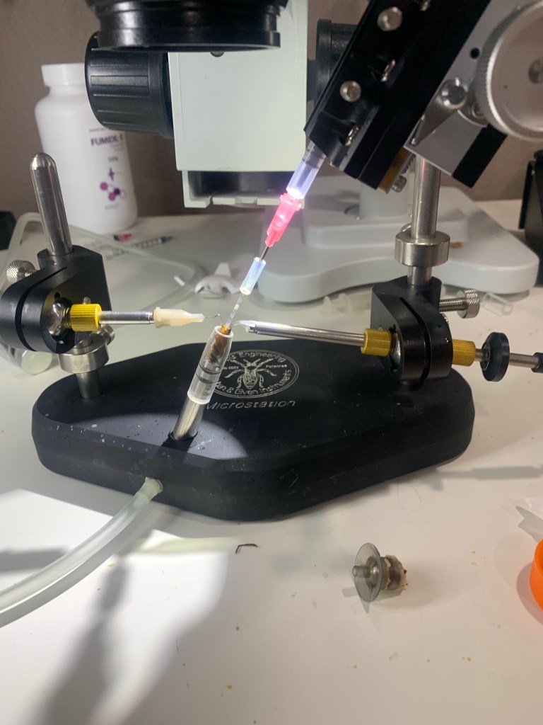 I know I haven’t posted in a while…just been laser focused on getting our first queens instrumentally inseminated. Was very exciting to have some success instrumental inseminating some bee queens!