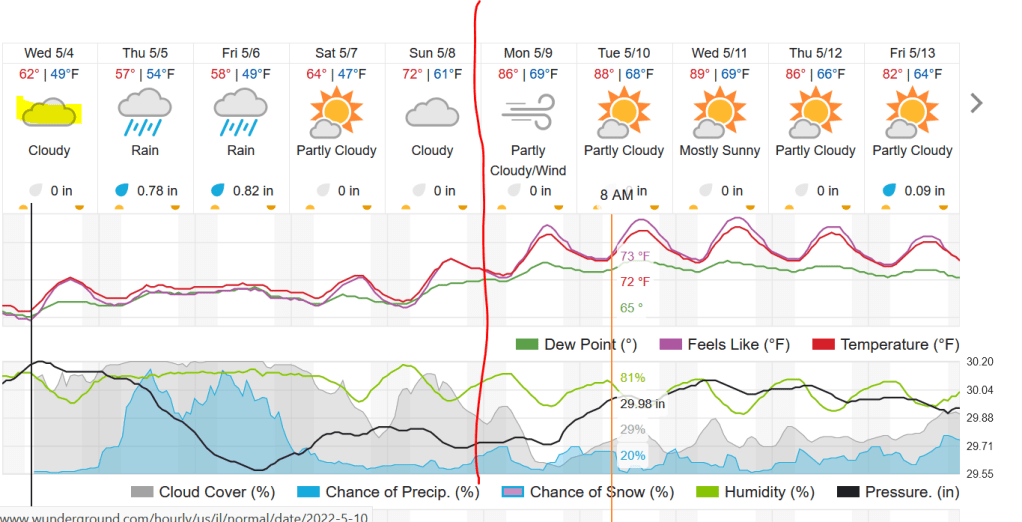 Here we are today on the highlighted day…two days before rain and 5 days before a HUGE jump in temperatures. 5/4 baseball game and track practice, 5/5 soccer game out of town w/ a track meet and 5/6-5/8 out of town baseball tournament w/ a side of mother’s day.